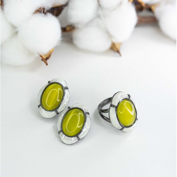 Кольцо женское из гипоаллергенного ювелирного сплава черного цвета с покрытием эмалью белого цвета. Вставка- улексит желтого цвета. Высота кольца- 2,0см. ширина- 1,5см. Размер-18,0.