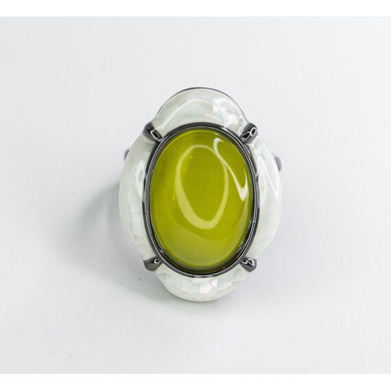 Кольцо женское из гипоаллергенного ювелирного сплава черного цвета. Вставка- улексит желтого цвета. Покрытие эмалью белого цвета. Высота кольца--3см, ширина-2см. Размер-19,0.