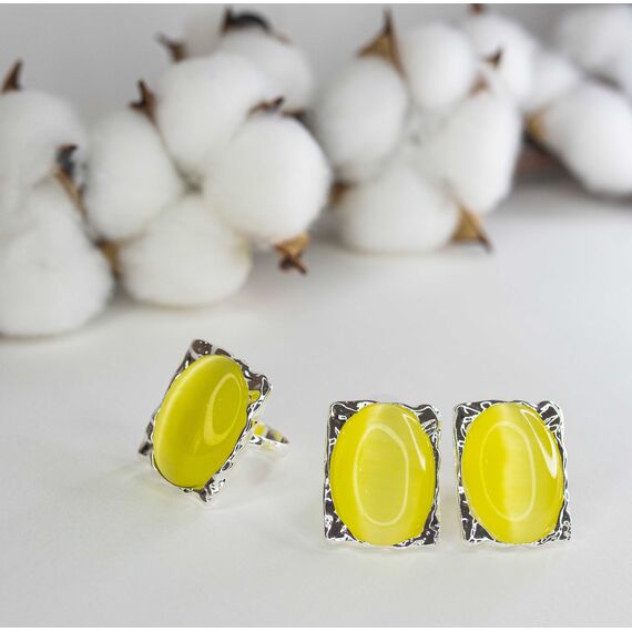 Кольцо женское из гипоаллергенного ювелирного сплава серого цвета. Вставка- улексит ( кошачий глаз) желтого цвета. Высота кольца-2,5см, ширина-2см. Размер-18,0.