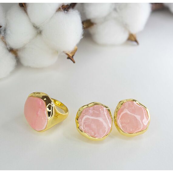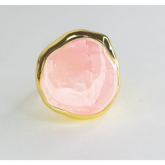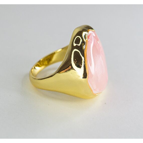 Кольцо из гипоаллергенного ювелирного сплава желтого цвета. Вставка- перламутр розового цвета. Высота кольца-2,5см, ширина-2,2см. Рамер-18,0.