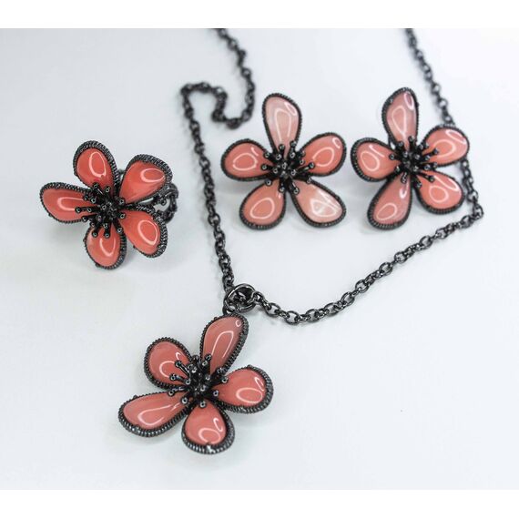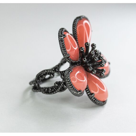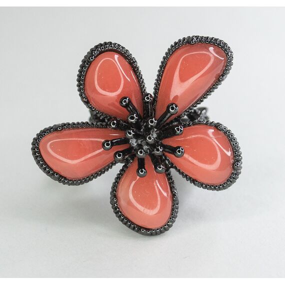 Кольцо женское из гипоаллергенного ювелирного сплава черного цвета и эпоксидной смолы кораллового цвета. Высота кольца-4см, ширина-4см. Размер-18,0.