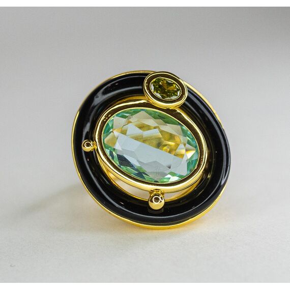 Кольцо женское из гипоаллергенного ювелирного сплава желтого цвета. Покрытие эмалью черного цвета. Вставка- кварц голубого и зеленого цвета. Высота кольца-2,5см, ширина-3,0см. Размер-18,0.