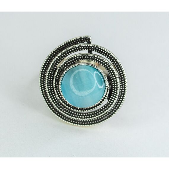 Кольцо женское из гипоаллергенного ювелирного сплава черного цвета. Вставка- улексит ( кошачий глаз) голубого цвета. Диаметр кольца- 2,5см, диаметр камня-1см. Размер-17,0.