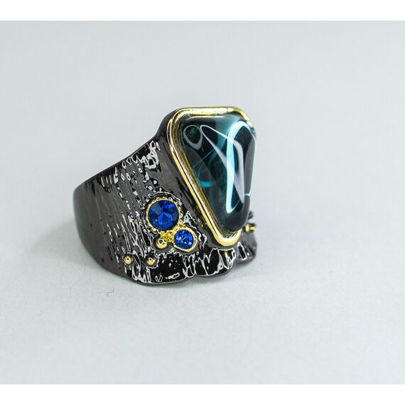 Кольцо женское из гипоаллергенного ювелирного сплава черного и желтого цвета. Вставка- улексит ( кошачий глаз), цвет- голубой и ювелирное стекло, цвет- синий. Высота кольца-2,2см, ширина-2,2см. Размер-18,0.