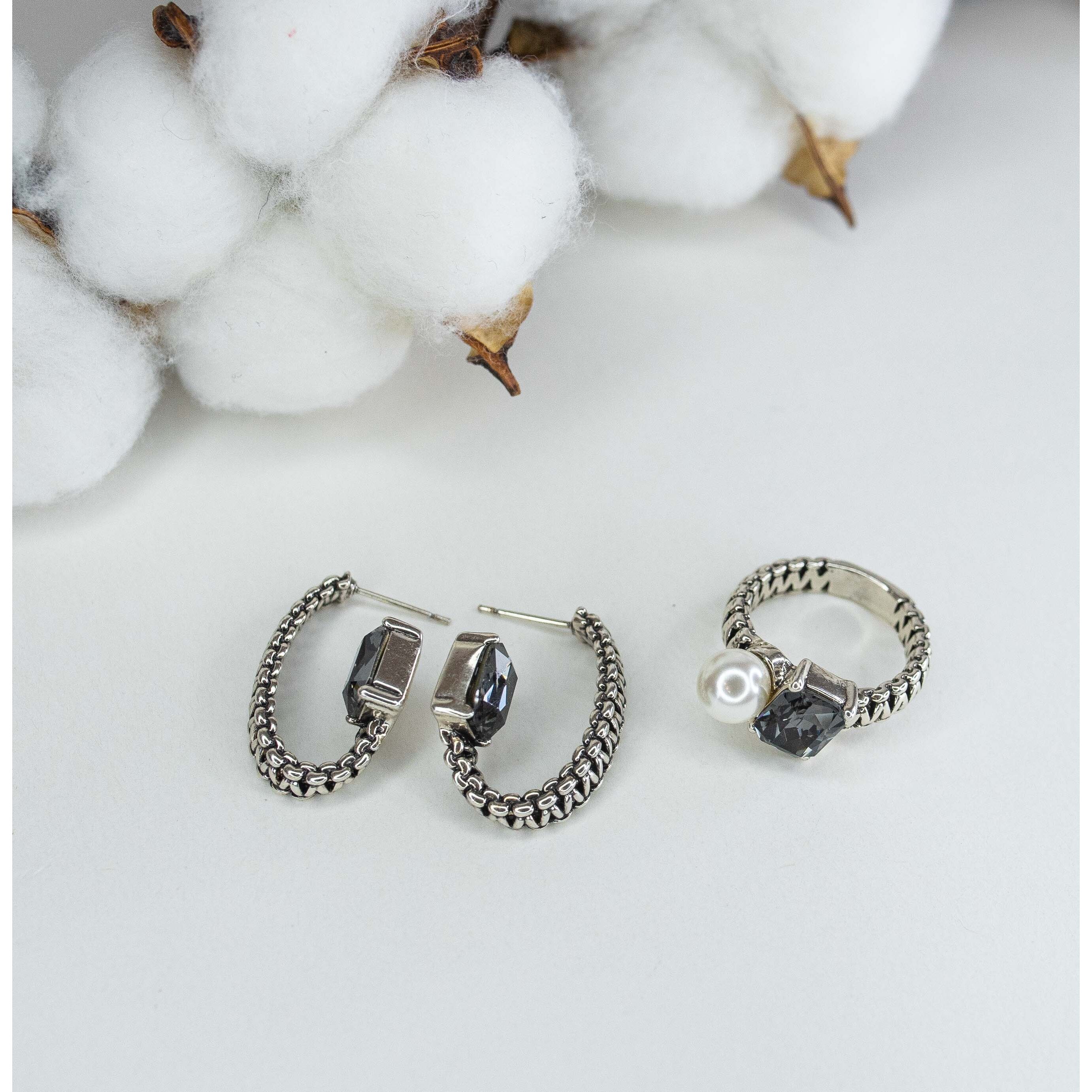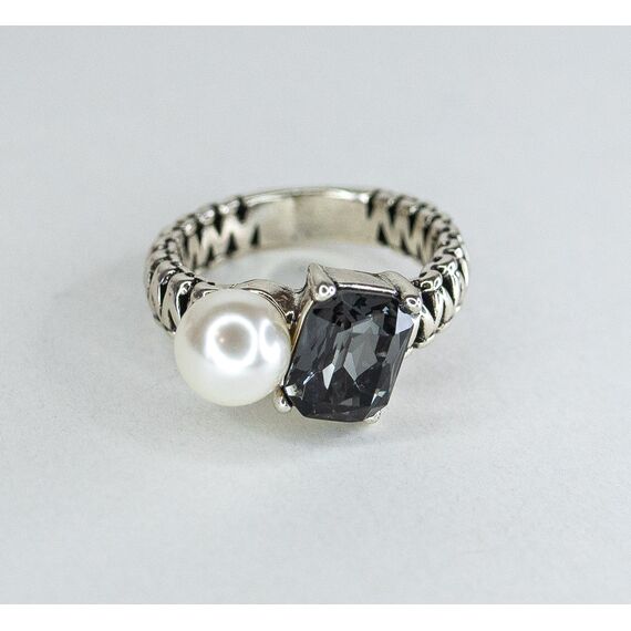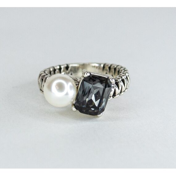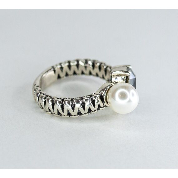 Кольцо женское из гипоаллергенного ювелирного сплава серого цвета .Вставка- иск. жемчуг белого цвета и ювелирное стекло, цвет- серый. Высота кольца-1,5см, ширина-2,0см. Размер-18,0.