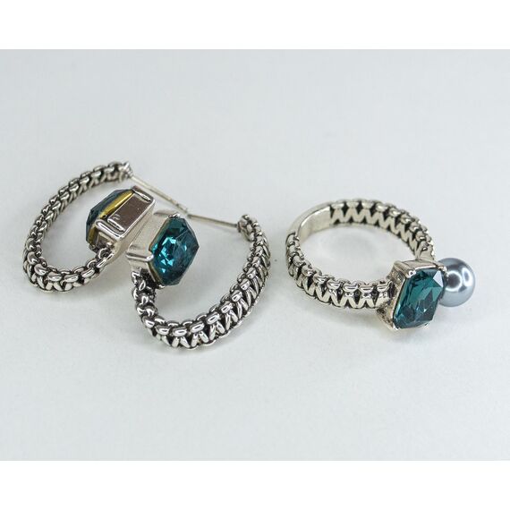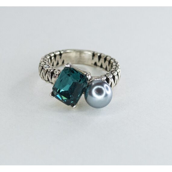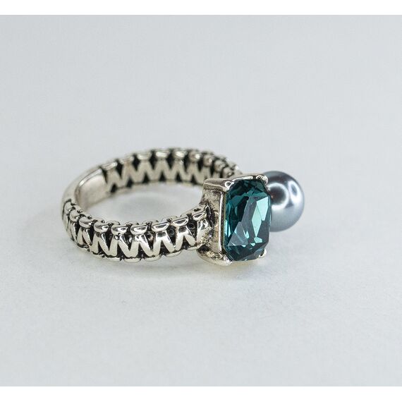 Кольцо из гипоаллергенного ювелирного сплава серого цвета.Вставка- иск. жемчуг серого цвета и ювелирное стекло синего цвета. Высота кольца-1,5см, ширина-2,0см. Размер-17,0.