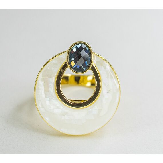 Кольцо женское из гипоаллергенного ювелирного сплава желтого цвета. Вставка- ювелирное стекло сиреневого цвета и перламутр белого цвета. Высота кольца--2,5см, ширина-2,5см. Размер-17,0.