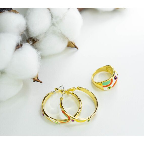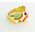 Кольцо женское из гипоаллергенного ювелирного сплава желтого цвета. Вставка- ювелирное стекло, цвет- зеленый, сиреневый, желтый. Покрытие эмалью белого, желтого и красного цвета. Высота кольца--1,5см, ширина-2,0см. Размер-18,0.