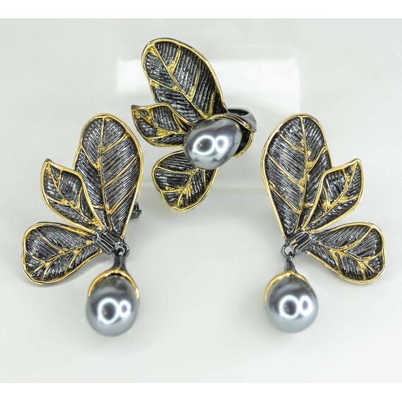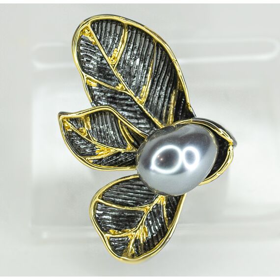 Кольцо женское из гипоаллергенного ювелирного сплава черного и желтого цвета. Вставка- иск. жемчуг серого цвета. Высота кольца-3,0см, ширина-2,0см. Размер-17,0.