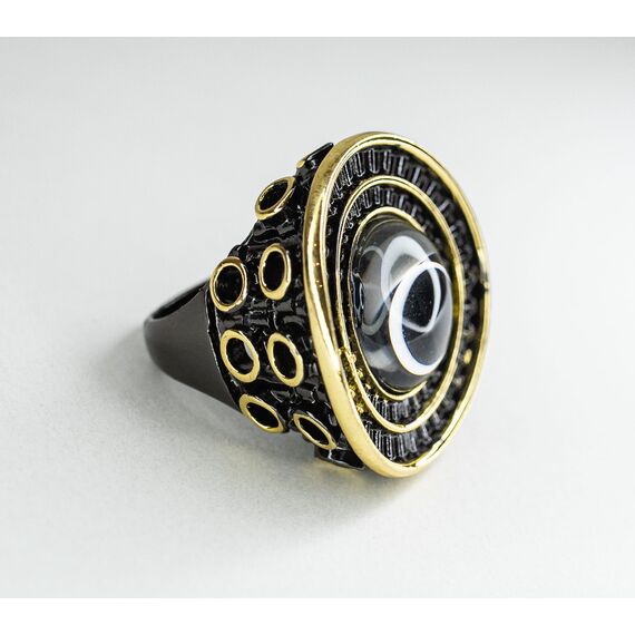 Кольцо женское из гипоаллергенного ювелирного сплава черного и желтого цвета. Вставка- улексит ( кошачий глаз), цвет- серый. Высота кольца-3,0см, ширина-3,0см. Размер-18,0.