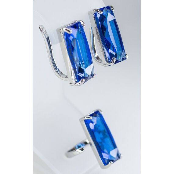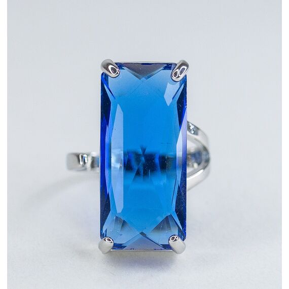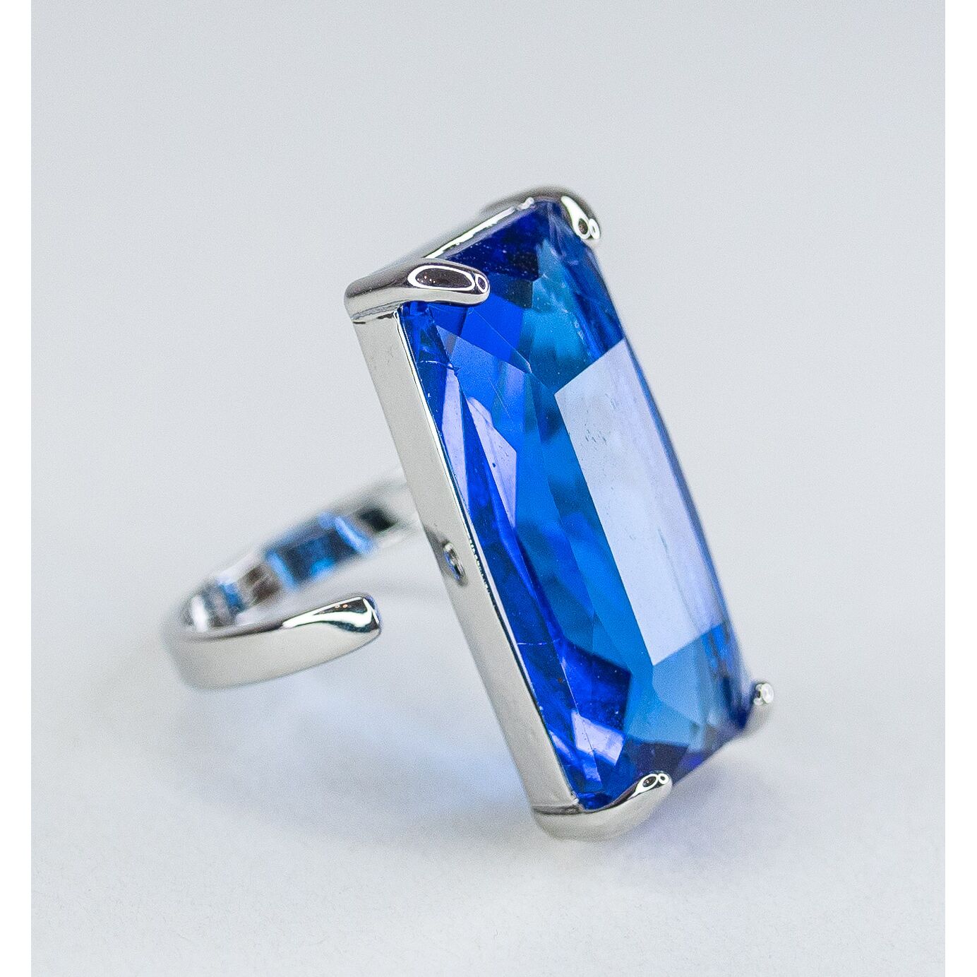 Кольцо женское из гипоаллергенного ювелирного сплава, цвет-серый. Вставка- ювелирное стекло синего цвета. Высота кольца-3,0см, ширина-1,0см. Кольцо- незамкнутое, безразмерное.