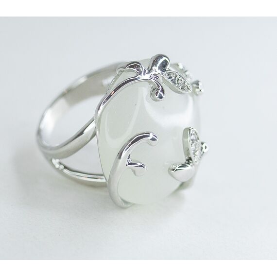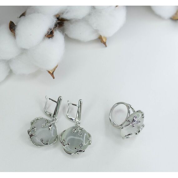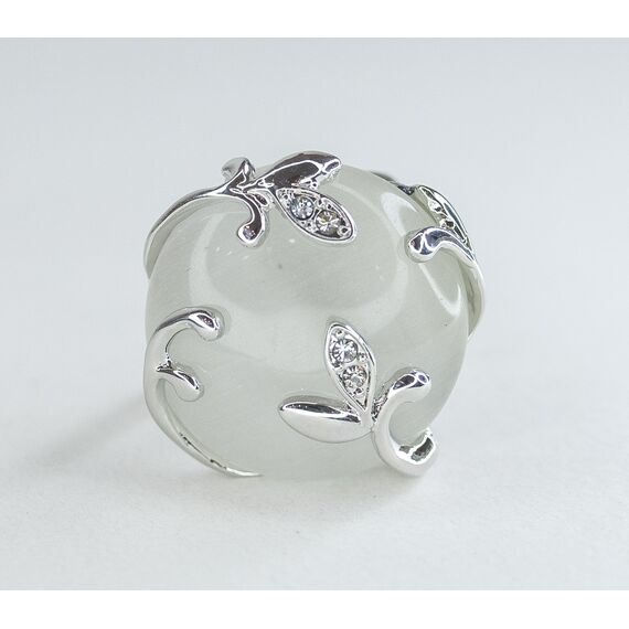 Кольцо из гипоаллергенного ювелирного сплава серого цвета. Вставка- улексит (кошачий глаз) серого цвета и ювелирное стекло белого цвета. Высота кольца-2,5см, ширина-2,5см. Размер-18,0.