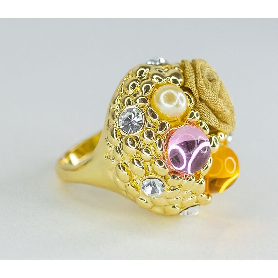 Кольцо из гипоаллергенного ювелирного сплава желтого цвета. Вставка- эпоксидная смола, цвет- розовый, желтый и иск. жемчуг белого цвета. Высота кольца-3,0см, ширина-3,0см. Размер-18,0.