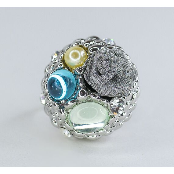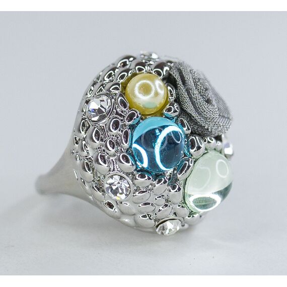 Кольцо из гипоаллергенного ювелирного сплава серого цвета. Вставка- эпоксидная смола, цвет- голубой, бирюзовый и иск. жемчуг бежевого цвета. Высота кольца-3,0см, ширина-3,0см. Размер-18,0.