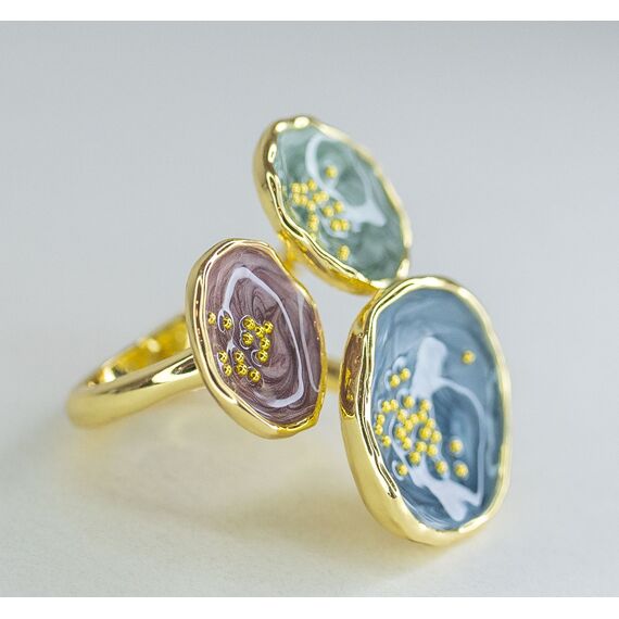 Кольцо из гипоаллергенного ювелирного сплава желтого цвета.Без вставок. Покрытие эмалью, цвет-голубой, зеленый, фиолетовый. Высота кольца-3,0см, ширина-2,5см. Размер-18,0.