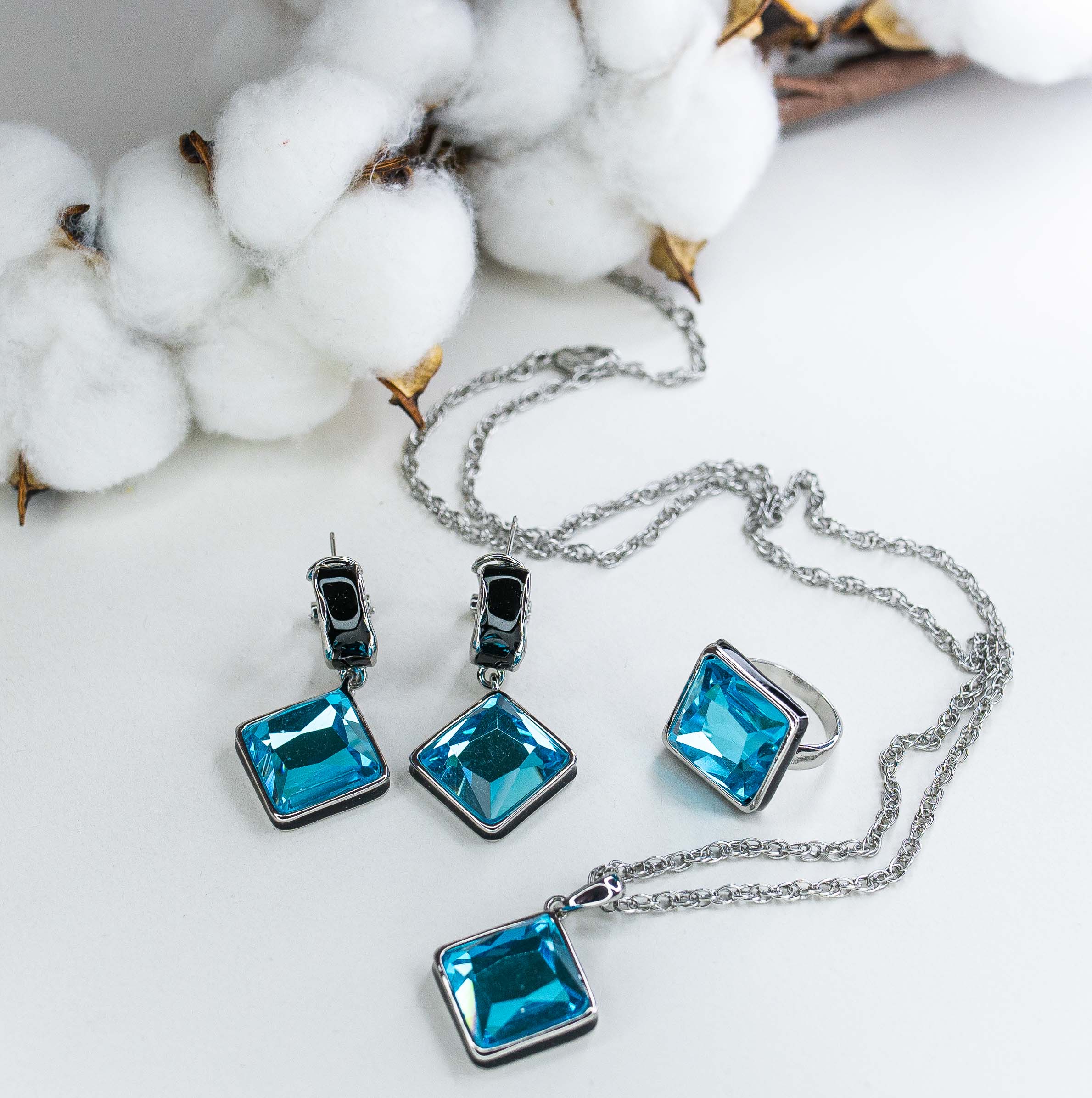 Кольцо женское из гипоаллергенного ювелирного сплава серого цвета. Вставка- ювелирное стекло голубого цвета. Высота кольца- 2,0см, ширина- 2,0см. Размер-17,0.
