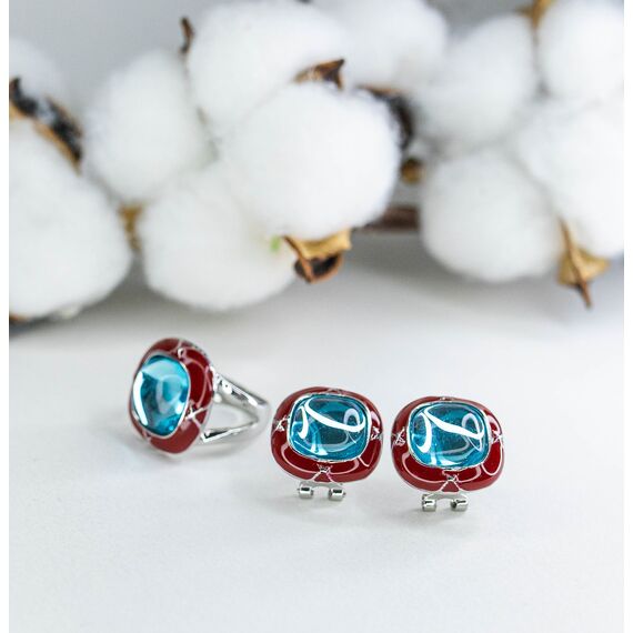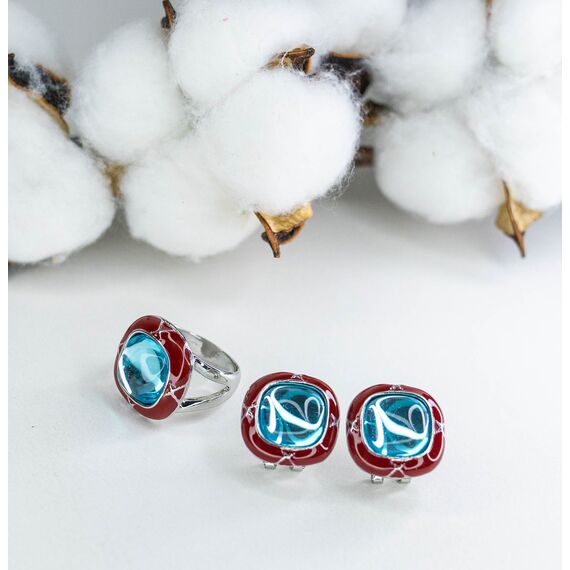 Кольцо женское из гипоаллергенного ювелирного сплава серого цвета. Покрытие эмалью, цвет- красный. Вставка- улексит (кошачий глаз) голубого цвета. Высота кольца- 2,0см, ширина- 2,0см. Размер-18,0.