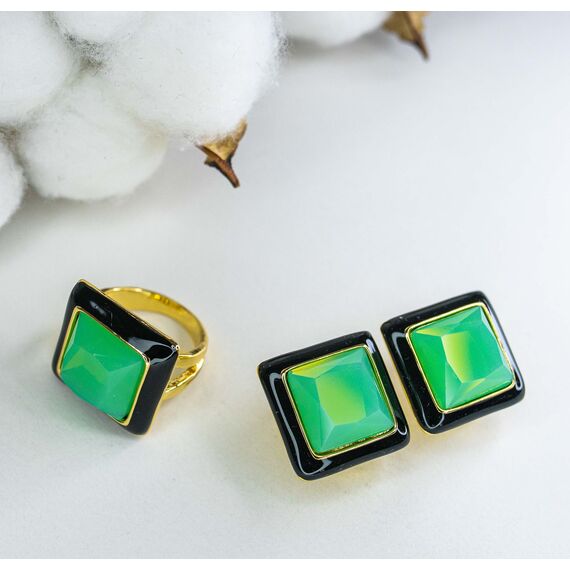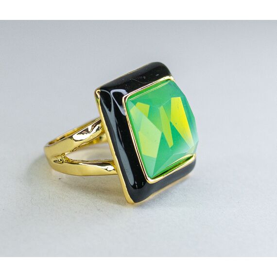 Кольцо женское из гипоаллергенного ювелирного сплава желтого цвета. Покрытие эмалью, цвет- черный. Вставка- кварц зеленого цвета. Высота кольца- 2,0см, ширина- 2,0см. Размер-17,0.
