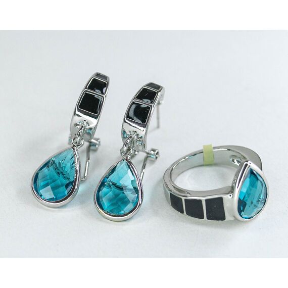 Серьги из гипоаллергенного ювелирного сплава серого цвета. Покрытие эмалью, цвет- черный. Вставка- кварц бирюзового цвета. Высота кольца- 1,5см, ширина- 2,0см. Размер-18,0.