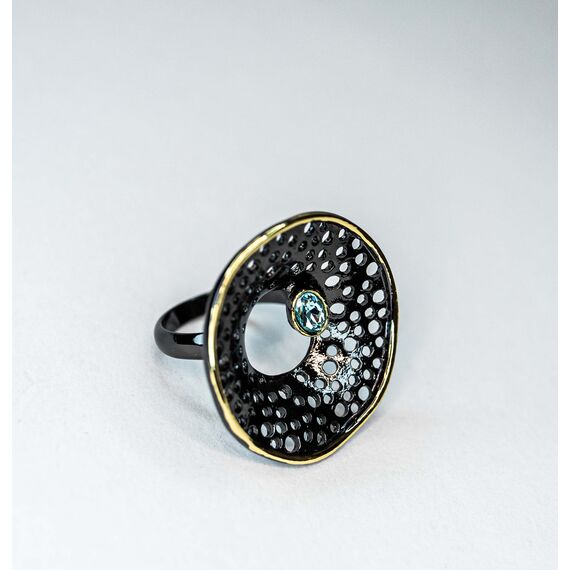Кольцо из гипоаллергенного ювелирного сплава черного и желтого цвета. Вставка- кварц, цвет- голубой. Высота кольца-3,0см, ширина-3,0см. размер-17,0.