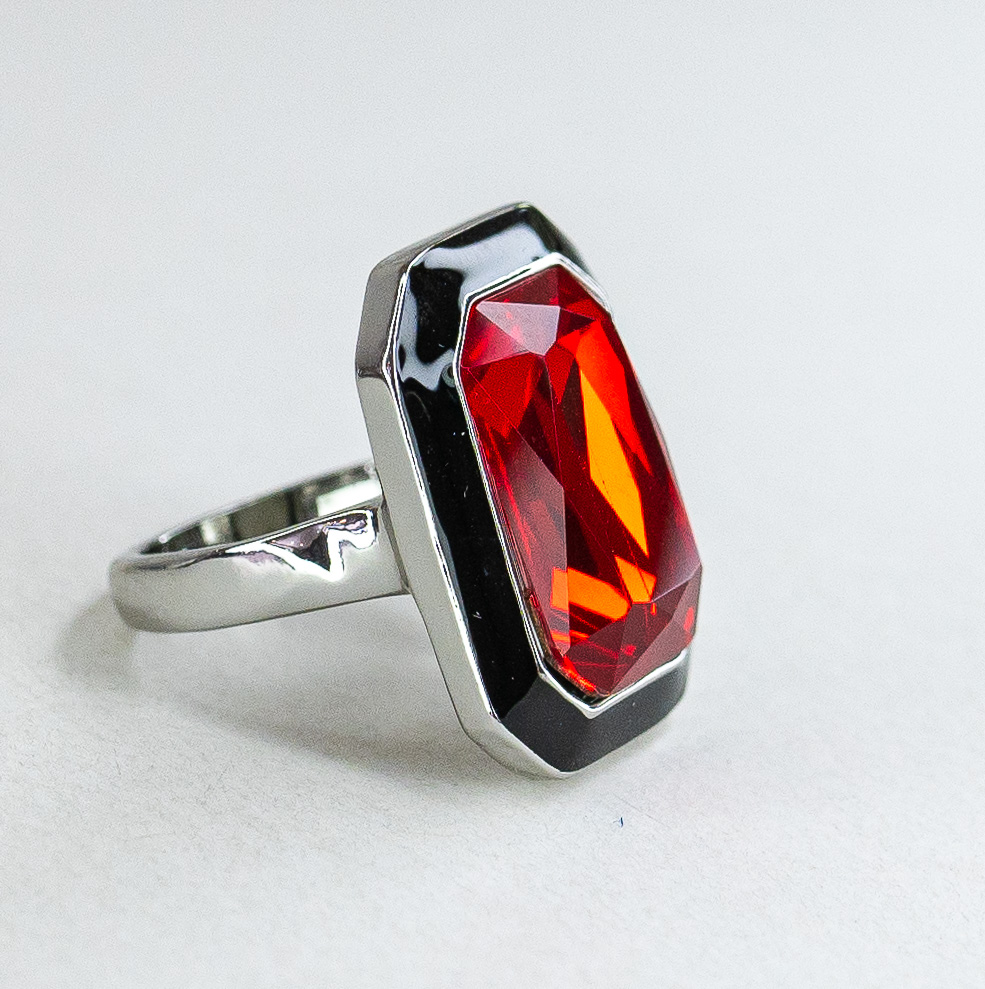 Кольцо женское из гипоаллергенного ювелирного сплава серого цвета. Вставка- кварц красного цвета. Покрытие эмалью, цвет- черный. Высота кольца-2,5см, ширина-2,0см. Размер-18,0.