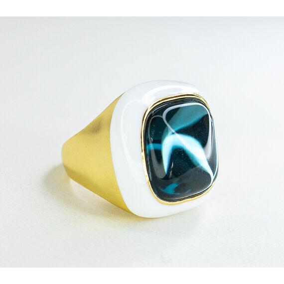 Кольцо женское из гипоаллергенного ювелирного сплава желтого цвета. Вставка- улексит (кошачий глаз), цвет- лондон блю. Покрытие эмалью, цвет-белый. Высота кольца-2,0см, ширина-2,0см. Размер-18,0.