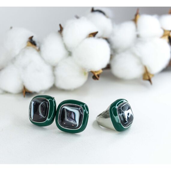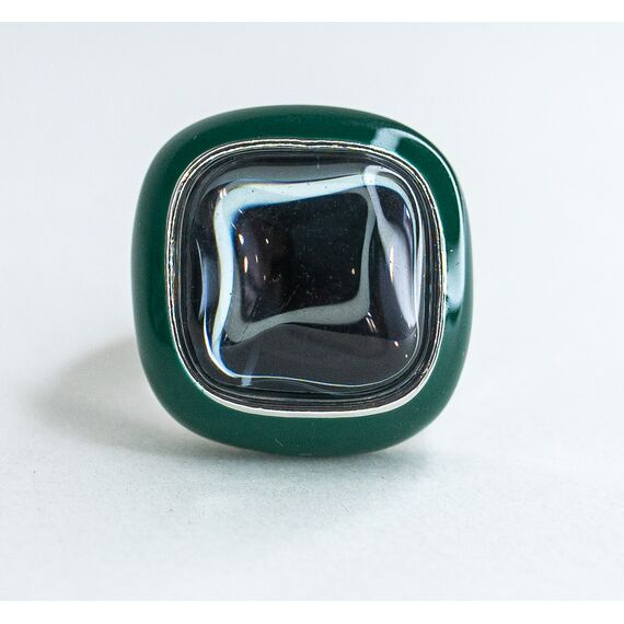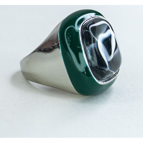 Кольцо женское из гипоаллергенного ювелирного сплава серого цвета. Вставка- улексит (кошачий глаз), цвет- темно-серый. Покрытие эмалью, цвет-зеленый. Высота кольца-2,0см, ширина-2,0см. Разме17,0.