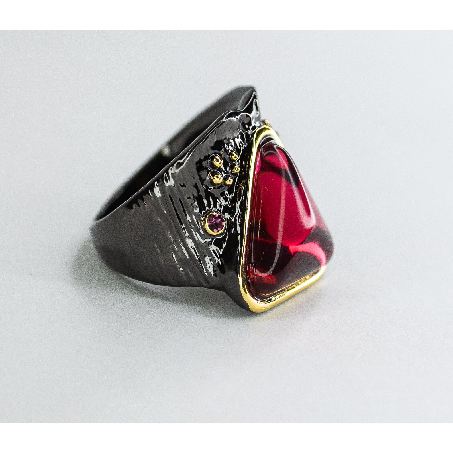 Кольцо женское из гипоаллергенного ювелирного сплава черного и желтого цвета. Вставка- улексит ( кошачий глаз) красного цвета и ювелирное стекло фиолетового цвета. Высота кольца -2,2см, ширина -2,2см. Размер-20,0.