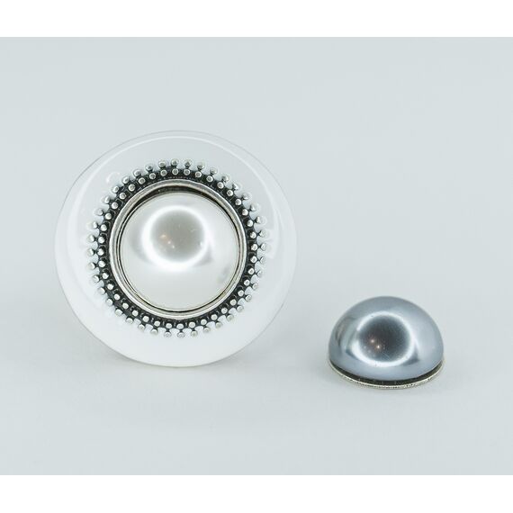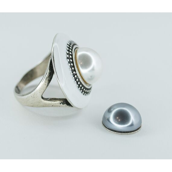 Кольцо женское из гипоаллергенного ювелирного сплава серого цвета. Вставка- жемчуг иск., цвет- белый и серый. Покрытие эмалью белого цвета. Высота кольца-2,0см, ширина-2,0см. Размер-17,0.