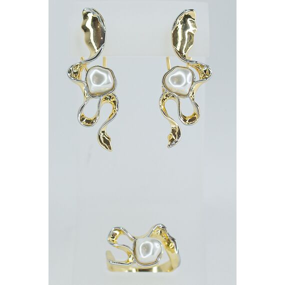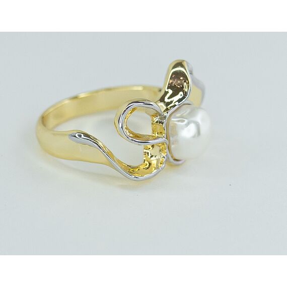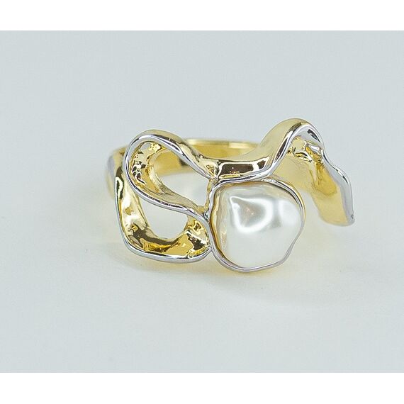 Кольцо женское из гипоаллергенного ювелирного сплава серого и желтого цвета. Вставка- жемчуг иск., цвет-белый. Высота кольца- 2,0см, ширина-2,0см. Размер-18,0.
