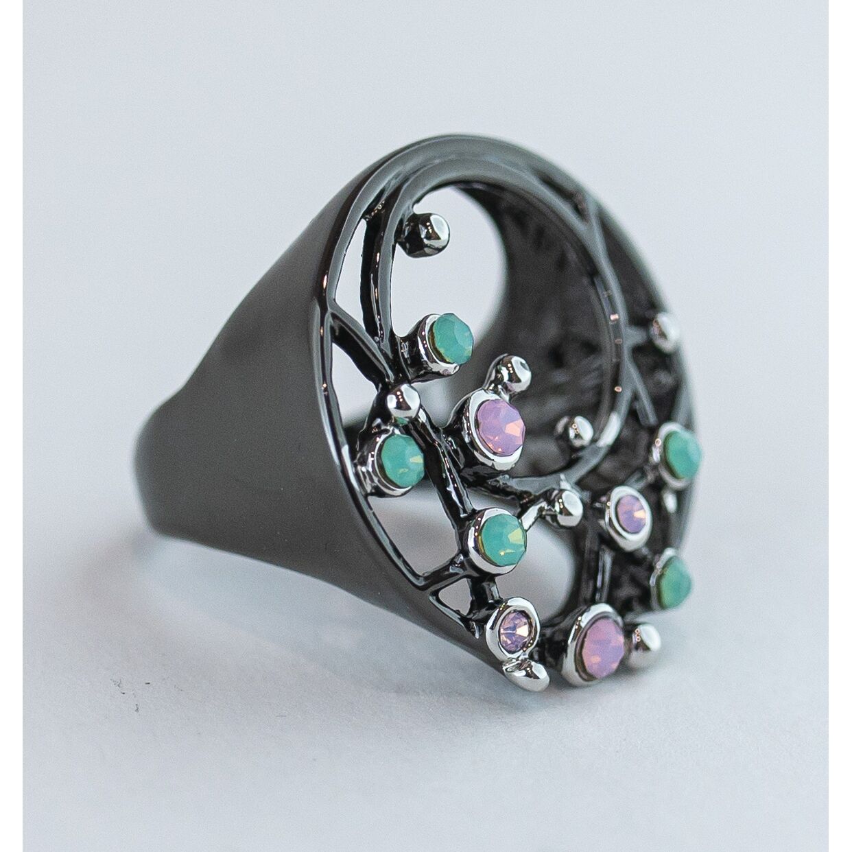 Кольцо женское из гипоаллергенного ювелирного сплава черного цвета. Вставка-ювелирное стекло розового и зеленого цвета. Высота кольца-2,5см, ширина-2,5см. Размер-18,0.