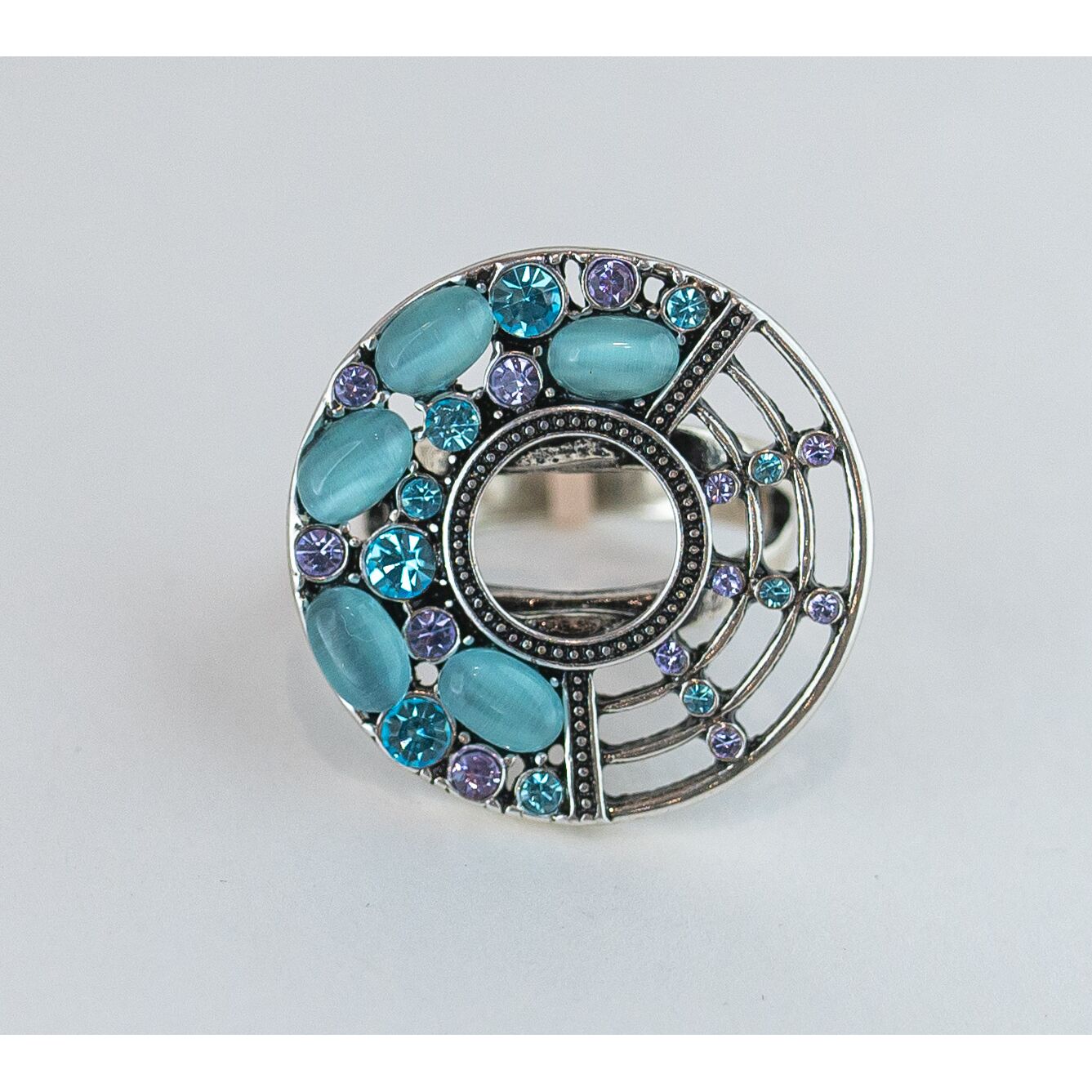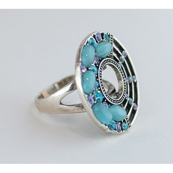 Кольцо женское из гипоаллергенного ювелирного сплава серого цвета. Вставка- улексит (кошачий глаз) голубого цвета и ювелирное стекло голубого, фиолетового цвета. Высота и ширина кольца-3,0см. Размер-19,0.