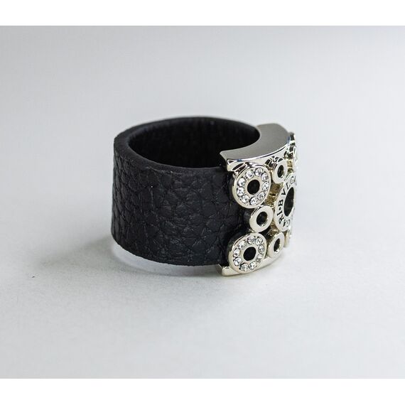 Кольцо женское из гипоаллергенного ювелирного сплава серого цвета и натуральной кожи черного цвета. Вставка- циркон белого цвета. Высота кольца-2,0см, ширина-2,0см. Размер-19,0.