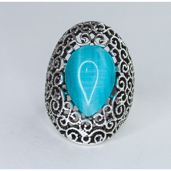 Кольцо женское из гипоаллергенного ювелирного сплава серого цвета. Вставка- улексит (кошачий глаз), цвет-голубой. Высота кольца- 3,0см, ширина- 2,0см. Размер-19,0.