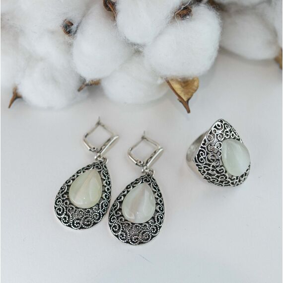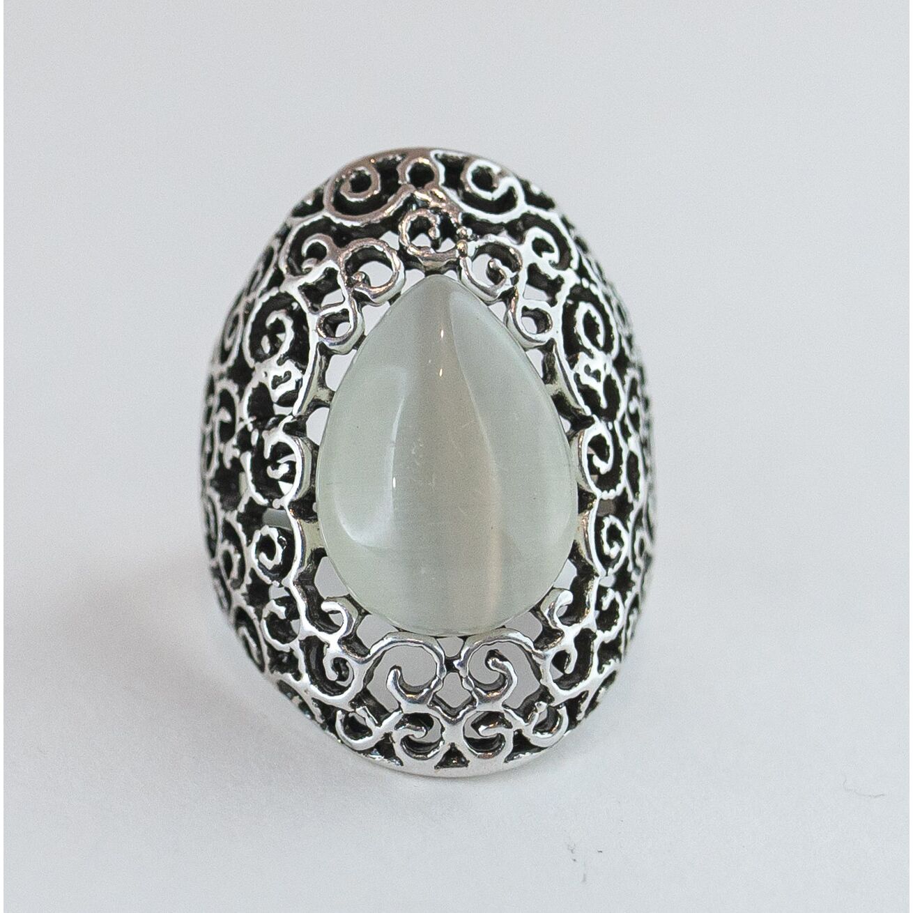 Кольцо женское из гипоаллергенного ювелирного сплава серого цвета. Вставка- улексит (кошачий глаз), цвет-серый. Высота кольца- 3,0см, ширина- 2,0см. Размер-19,0.