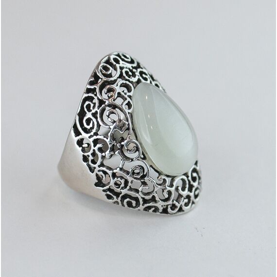 Кольцо женское из гипоаллергенного ювелирного сплава серого цвета. Вставка- улексит (кошачий глаз), цвет-серый. Высота кольца- 3,0см, ширина- 2,0см. Размер-18,0.