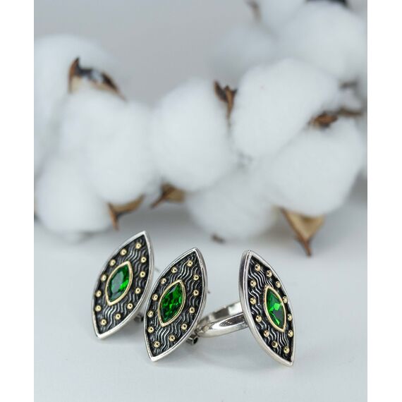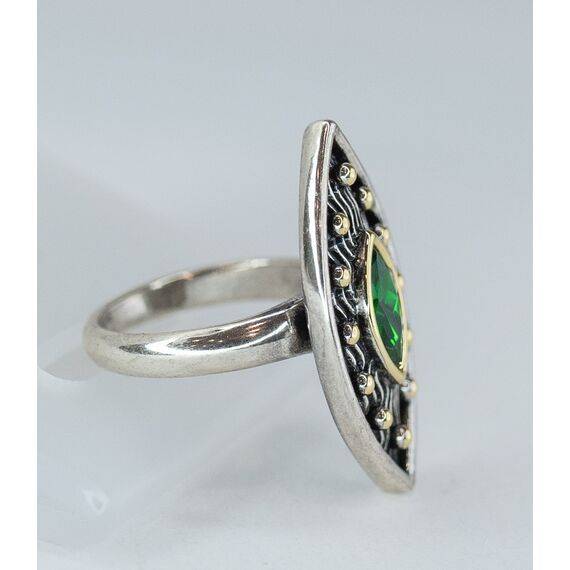 Кольцо женское из гипоаллергенного ювелирного сплава желтого и серого цвета. Вставка- кварц, цвет- зеленый. Высота кольца- 3,0см, ширина- 1,5см. Размер-18,0.
