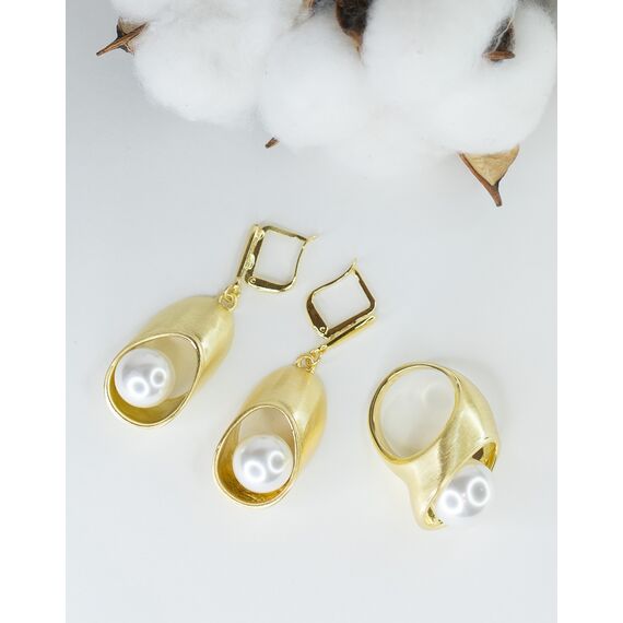 Кольцо женское из гипоаллергенного ювелирного сплава желтого цвета. Вставка- жемчуг иск. белого цвета. Высота кольца-2,0см, ширина-2,0см. Размер-18,0.