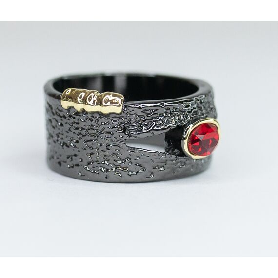 Кольцо женское из гипоаллергенного ювелирного сплава черного и желтого цвета. Вставка- ювелирное стекло красного цвета. Высота кольца- 1,0см, ширина-2,0см. Размер-17,0.