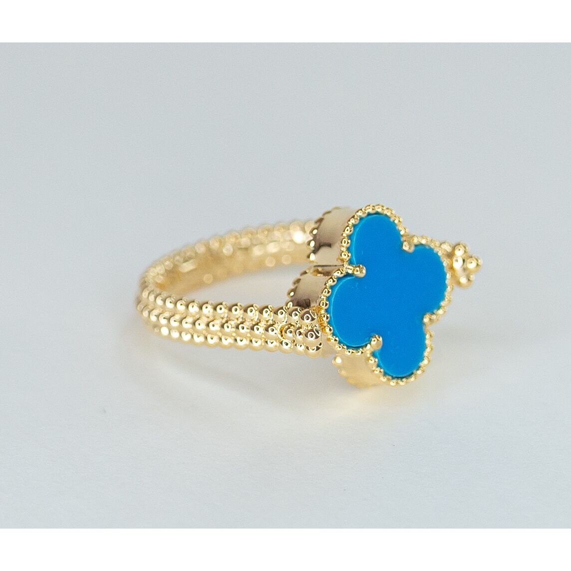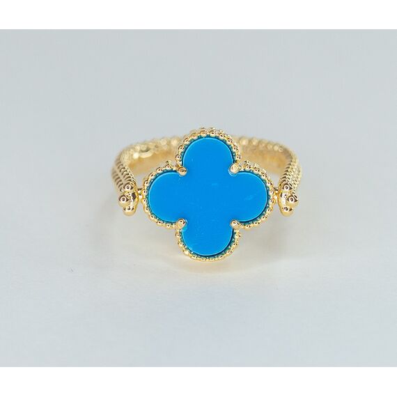Кольцо женское из высококачественного гипоаллергенного ювелирного сплава желтого цвета с покрытием эмалью ( с одной стороны) голубого цвета. Высота кольца- 0,2см, ширина-1,5см. Размер-18,0.
