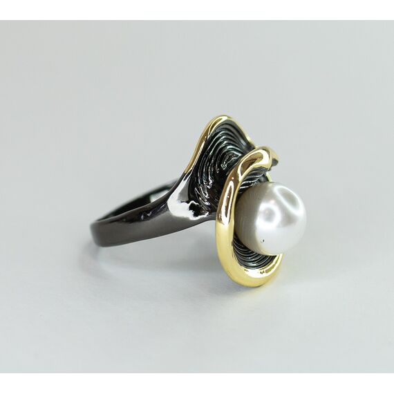Кольцо женское из гипоаллергенного ювелирного сплава черного и желтого цвета. Вставка- жемчуг майорка ( диаметр камня-1,0см) белого цвета. Высота кольца-2,0см, ширина-2,0см. Размер-19,0.