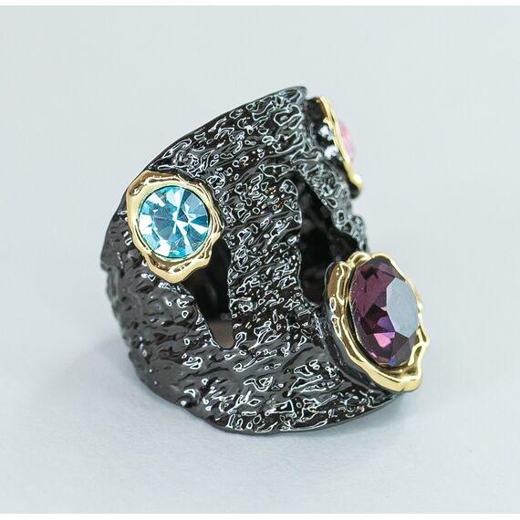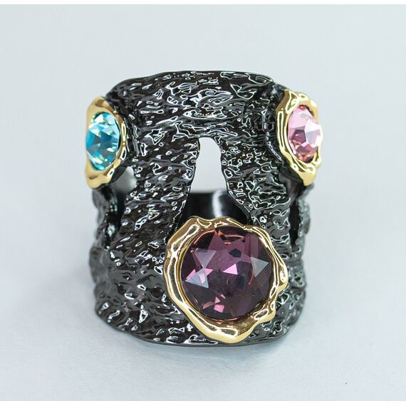 Кольцо женское из гипоаллергенного ювелирного сплава черного и желтого цвета. Вставка- кварц, цвет- голубой, розовый. сиреневый. Высота кольца- 3,0см, ширина-2,0см. Размер-19,0.