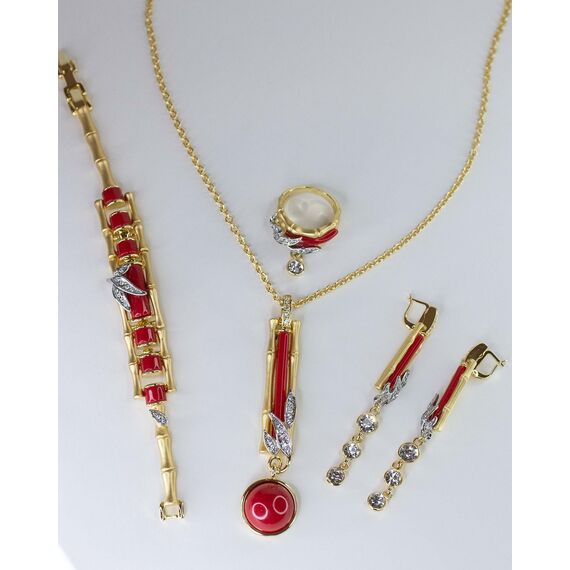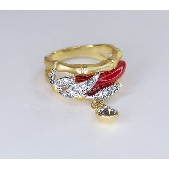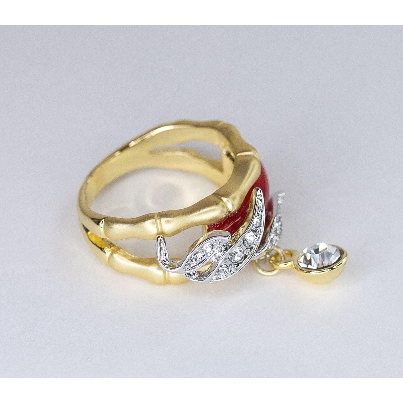 Кольцо женское из гипоаллергенного ювелирного сплава желтого и серого цвета с покрытием эмалью красного цвета. Вставка- ювелирное стекло, цвет- белый. Высота кольца- 1,0см, ширина- 2,0см. Размер-19,0.