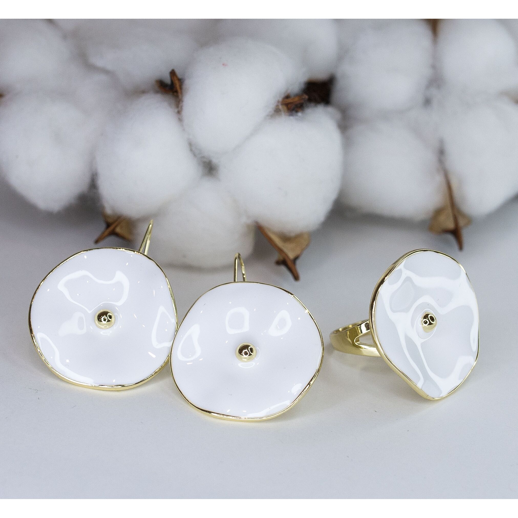 Кольцо женское из гипоаллергенного ювелирного сплава желтого цвета с покрытием эмалью белого цвета. Без вставок. Высота кольца- 3,0см, ширина- 3,0см. Размер-18,0.