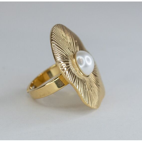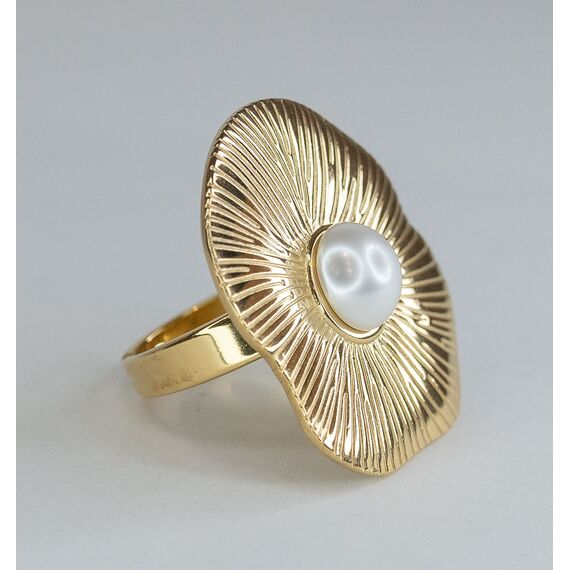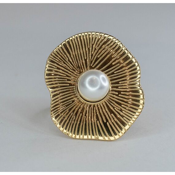 Кольцо женское из гипоаллергенного ювелирного сплава желтого цвета. Вставка- жемчуг иск. белого цвета. Диаметр кольца- 2,5см. Размер-18,0.