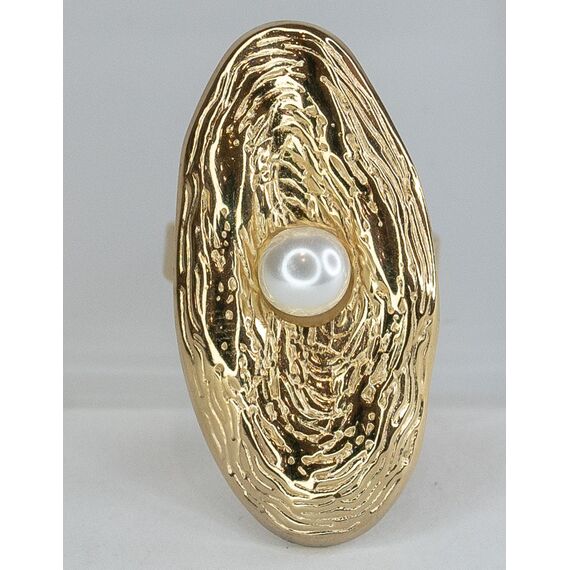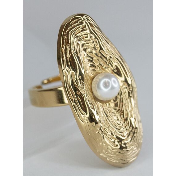 Кольцо женское из гипоаллергенного ювелирного сплава желтого цвета. Вставка- жемчуг иск. белого цвета. Высота кольца- 2,5см., ширина-1,5см. Кольцо незамкнутое, безразмерное.