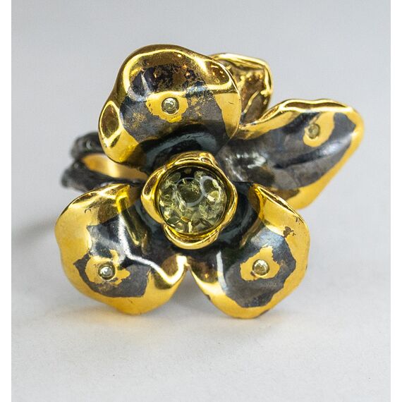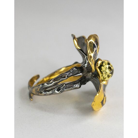 Кольцо женское из гипоаллергенной бронзы с позолотой и родием. Вставка- нат.янтарь зеленого цвета в форме шарика ( размер камня- 0,5/0,5см) и фианит белого цвета. Высота кольца- 2,0см, ширина-2,0см. Кольцо незамкнутое, безразмерное.