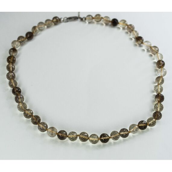 Бусы из раухтопаза, цвет - коричневый различных оттенков. Диаметр бусин от 0,7см, собраны в один ряд. Замок - карабин из серебра 925 пробы. Длина бус - 45,0см.