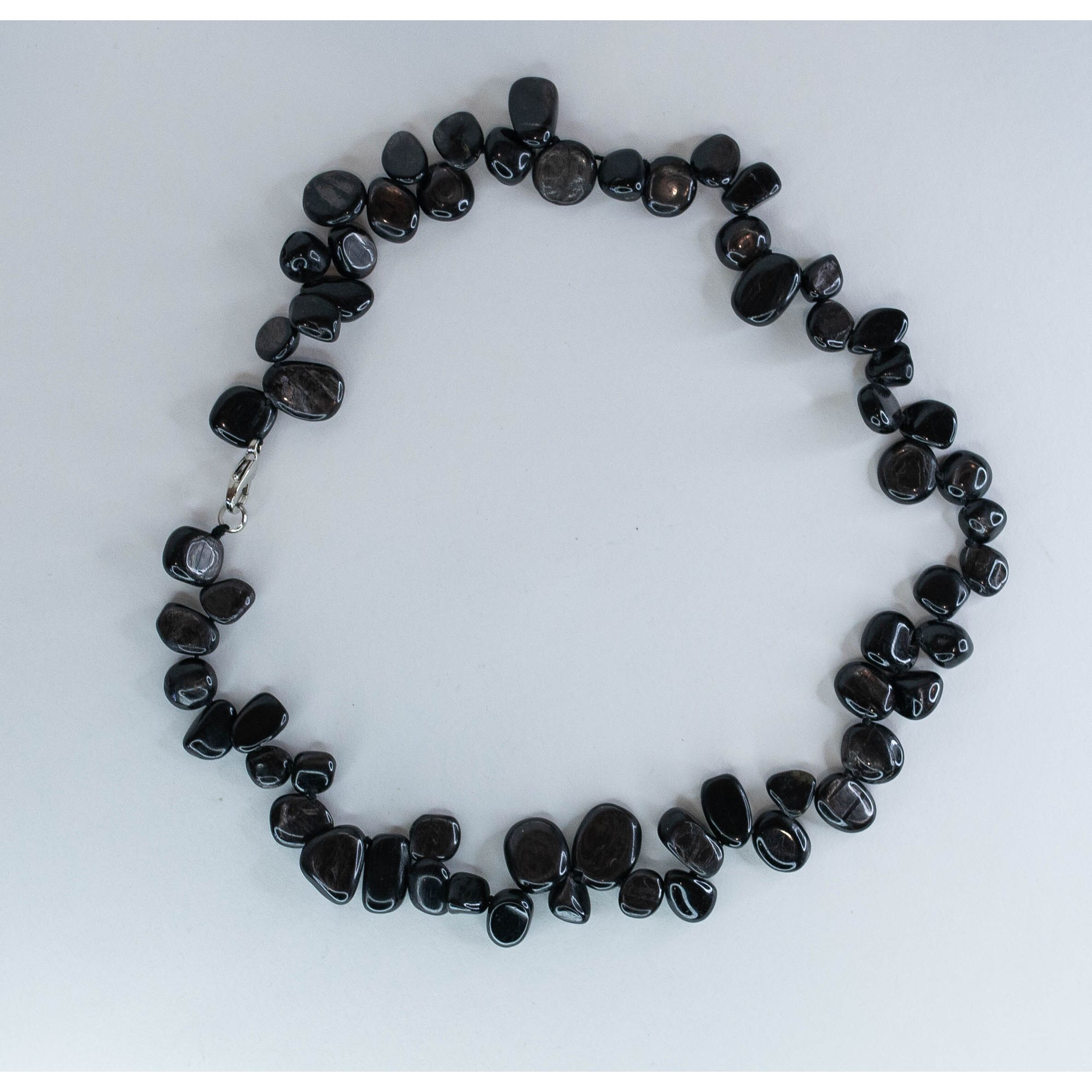 Бусы из черного агата, размер бусин-1,5/1,0см, длина-50,0см. Замок- карабин из ювелирного сплава серого цвета.