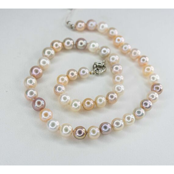 Бусы из природного речного жемчуга почти сферической формы (9-9,5мм). Бусины теплых белых и пудровых оттенков с блеском перламутрового слоя. Длина-45,0см. Замок из гипоаллергенного ювелирного сплава серого цвета- шпрингельный.